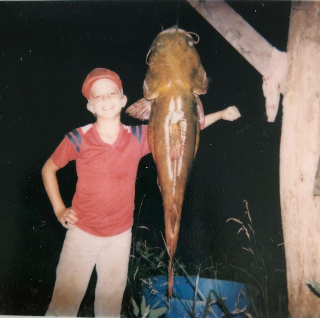 At one point we were pulling in our lines to head to another spot on the lake. My younger brother was having trouble getting his line in. The reel seemed to catch. Papaw confidently walked across the rocking fishing boat and started helping my brother untangle his line. I was staring off toward my bobber while reeling it in when I noticed my brother’s bobber shoot under the water in a hurry. The sudden pull on the line caught Papaw off guard and, luckily, he’d untangled the line enough so that it wouldn’t snap under the fierce pull of whatever was on the other end. My younger brother took the first shift, alternately reeling in, then letting the line out slowly, tiring out his quarry. After about 15 minutes, it was my turn. I reeled, as coached by Papaw, for another fifteen minutes until my arms and back burned from the effort. We seemed to be making some headway in getting the fish closer to the boat. After my older brother’s turn, it was my younger brother who finished the task. I was not prepared for the monster that surfaced. The boat was anchored at only the bow to the floor of the lake and the monstrous flathead was pulling us in a slow circle around the anchor. The fish next to the side of the boat finally, Papaw used what looked like a meat hook to catch the inside part of the gaping maw of our prey, and ultimately to get her into a large net and onto the floor of the boat. I remember the catfish weighed 38.5 pounds. It was the largest fish I’d ever been a part of catching and well worth the effort of the long day.